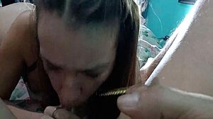 argentinian chubby milf with glasses gives deepthroat blowjob and tit handjob until cum in mouth
