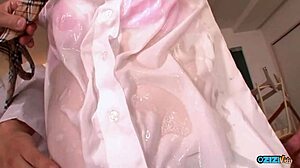 horny milf jacky joy lets a lucky man shoot his load on her big titties after blowjob