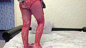 Brunette milf Angela boldly dances in red pantyhose seducing young cocks and cunts