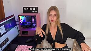 Blonde Secretary Teases Wanking Sub Voyeuristically