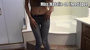 Whoa Natalie totally wets her tight jeans pants omorashi style 💦😲🩳