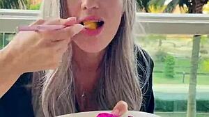 Bare toes from latina goddess slowly crushing juicy fruit with close-up wet sucking and crushing sounds
