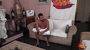 Skinny Blonde Sara Bell Bent Over Squirting in Gym with Barefoot Trainer Session