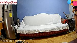 Whoa, spying on cute nympho humping pillow then fucking her while parents in kitchen!