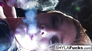 Blonde Shyla indulges in smoking fetish with big tits on display. Her solo act mesmerizes with every puff.