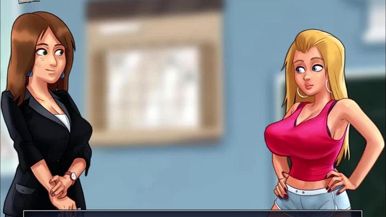 In Summertime Saga, pervert neighbor spies on her and slutty friend in cheerleader outfits