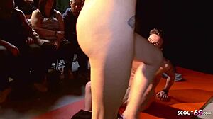"Young German model Carla Mai seduces to fuck with huge monster cock in front of people at outdoor casting"