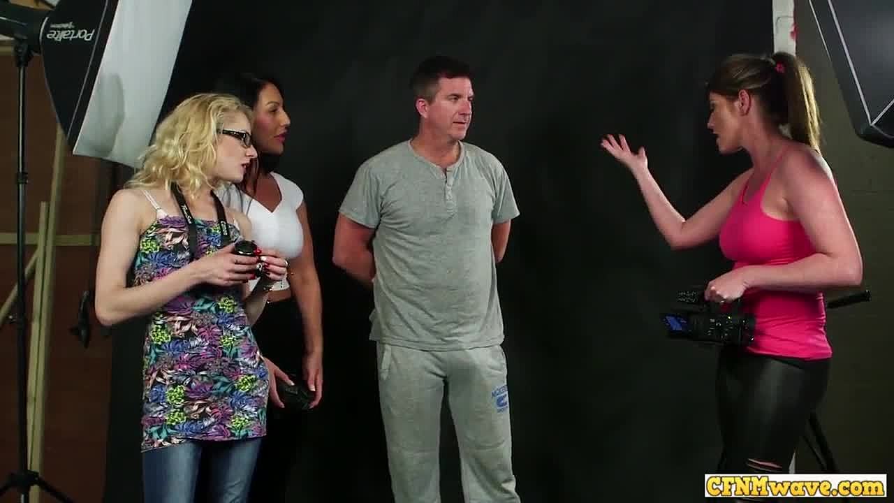 so these two chicks were dominating this guy in a cfnm threesome, giving him double handjobs.