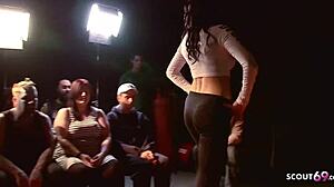 "Young German model Carla Mai seduces to fuck with huge monster cock in front of people at outdoor casting"